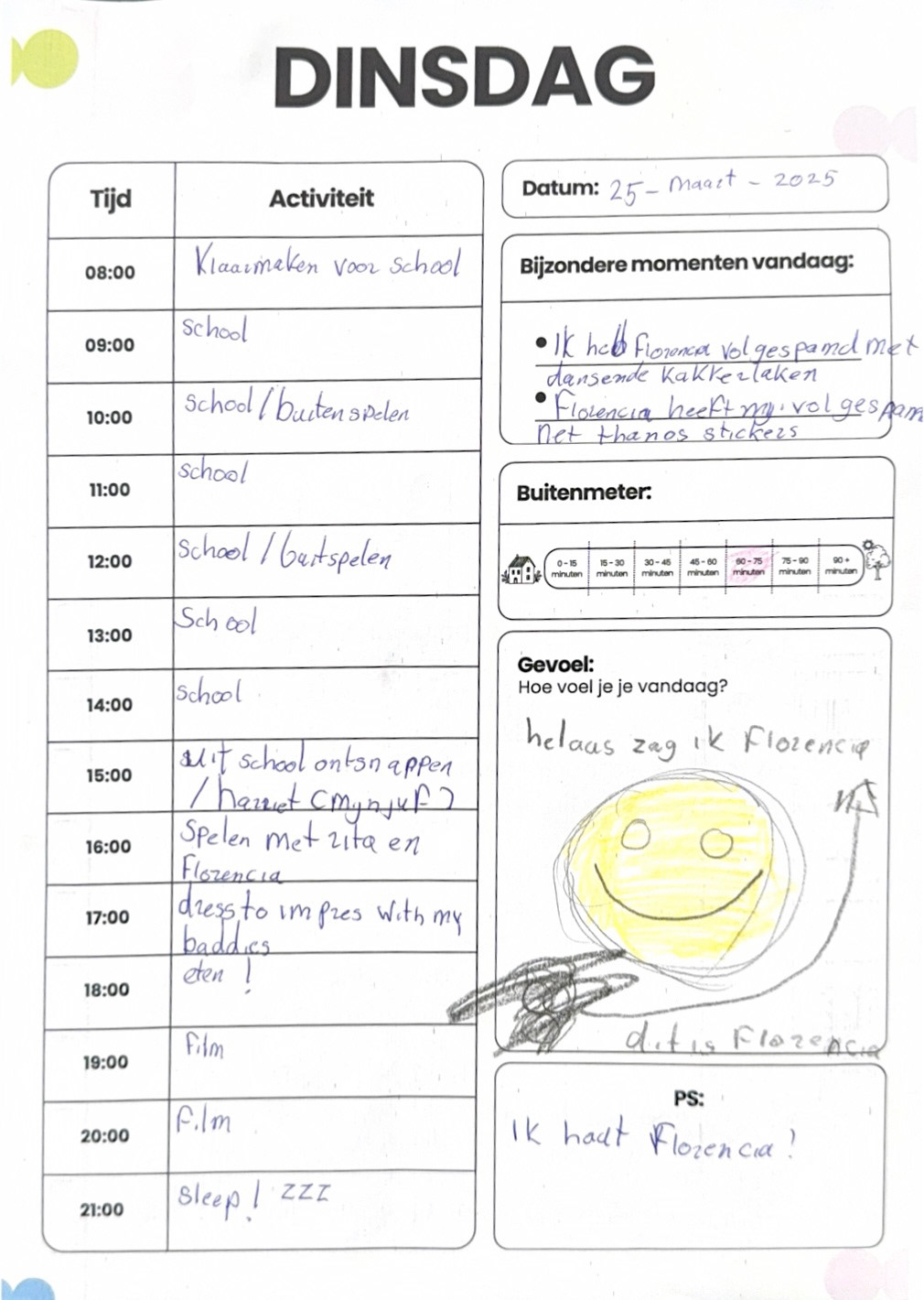 Een terugkerende probe gedurende de week was de day in the life. In de kit zaten 7 templates waar de deelnemers hun dag konden beschrijven.